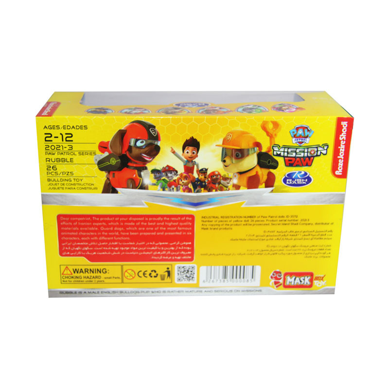 اسباب بازی سگ نگهبان رابل Rubble مدل ماسک ( Mask ) این اسباب بازی براساس شخصیت کارتون سگهای قهرمان ( سگهای نگهبان ) با نام رابل طراحی و عرضه شده است اسباب بازی سگ نگهبان فوق دارای برند ماسک بوده و تولید داخل است . اسباب بازی سگ نگهبان با برند ماسک نسبت به مشابه خارجی خود از کیفیت قابل فبول و قیمت مناسبتری برخوردار است. شخصیت های کارتون سگ های نگهبان یا سگ های قهرمان ، جزء شخصیت های محبوب کودکان می باشند.