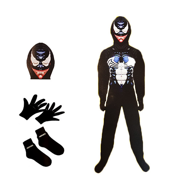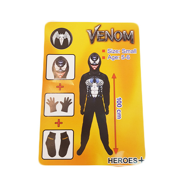 این ست لباس ایفای نقش ونوم نمونه کم نظیری از لباسهای شخصیتهای ابرقهرمانان است که شامل یک عدد لباس سرهمی، نقاب، یک جفت دستکش و یک جفت جوراب میباشد. برای اندازه گیری دقیق و خرید بهترین سایز برای کودک خود قد لباس را از سر شانه تا مچ پا اندازه بگیرید. قد لباس از سرشانه تا مچ پا این ست شامل بسته بندی جعبه ای می باشد.