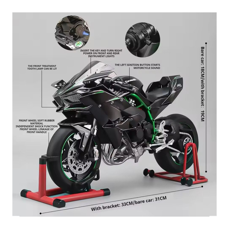 ماکت موتورسیکلت کاوازاکی نینجا H2R یک مدل کوچک و دقیق از موتورسیکلت سوپراسپرت افسانهای کاوازاکی نینجا H2R است این ماکت با جزئیات دقیق و ویژگیهای منحصر به فرد یک انتخاب عالی برای علاقهمندان به موتورسیکلت و کلکسیونرها است قابلیت روشن شدن چراغ جلو چرخ عقب با گاز دادن حرکت میکند از اگزوز بخار میآید هنگامی که باک آب باشد با چپ و راست کردن فرمان چرخ جلو چپ و راست میشود فرمان گاز با بخار هماهنگی دارد باک با آب پر میشود چراغ ها روشن میشوند ابعاد این ماکت 33 در 13 در 19 سانتیمتر است و از مواد با کیفیت ساخته شده است این ماکت یک هدیه عالی برای علاقهمندان به موتورسیکلت و یک افزودنی ارزشمند به هر کلکسیونی است.