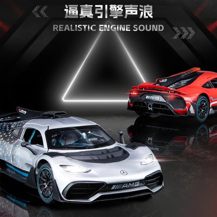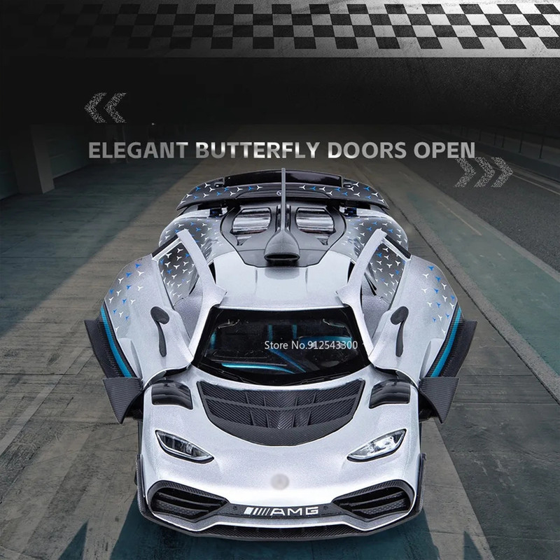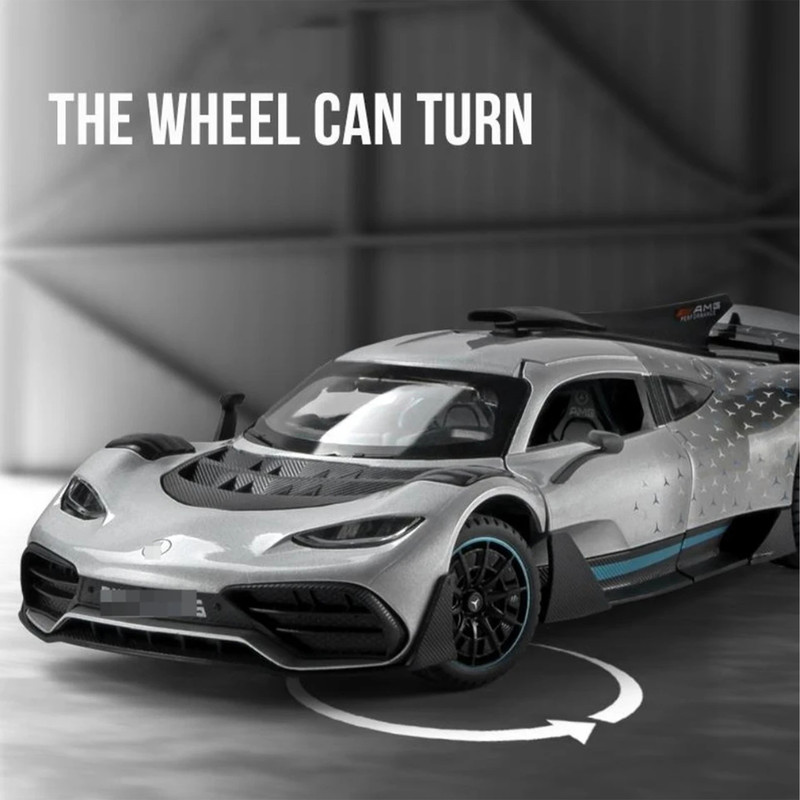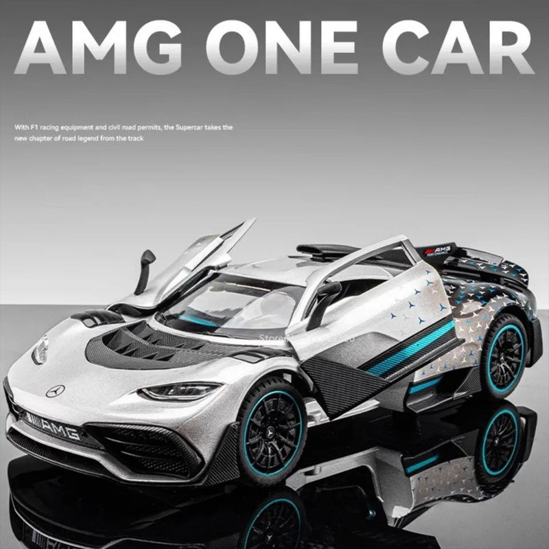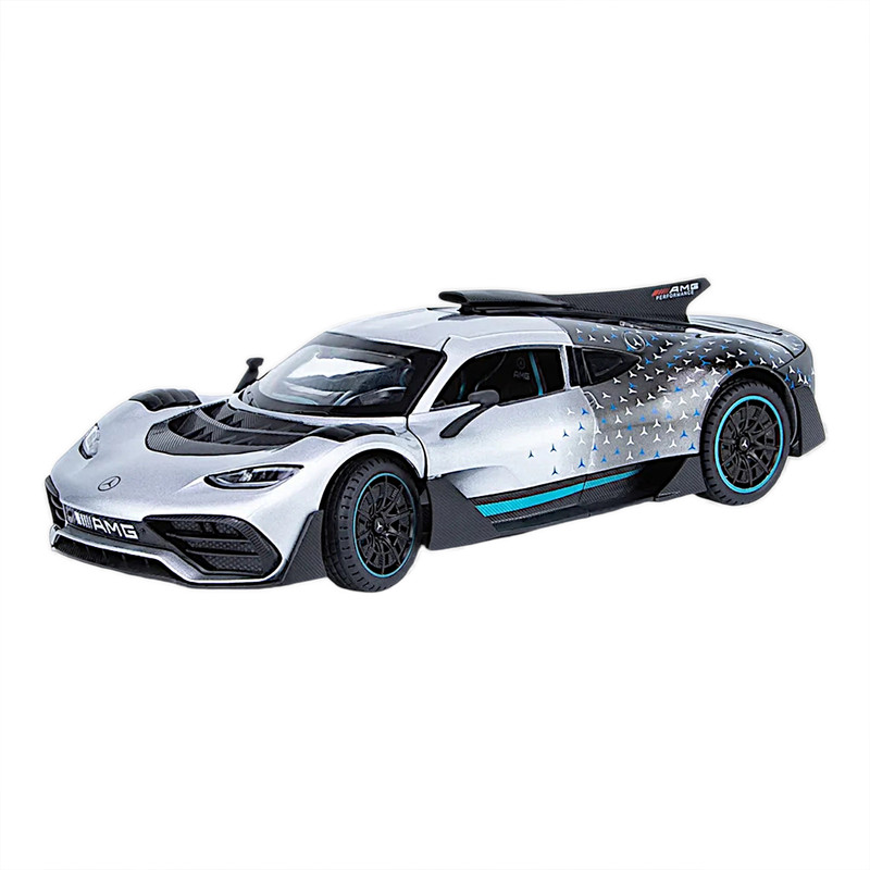 سه درب باز شو - باله عقب باز شو و متحرک-دارایچراغ های عقب و جلو - موزیکال(شامل سه موزیک : استارت و گاز دادن-دزدگیرو باز شدن درب ها )-فرمان پذیر-جزئیات بالا-مرسدس-آامگ وان (انگلیسی: Mercedes-AMG One؛ آر۵۰، شناختهشده با نام وان (انگلیسی: ONE)) یک خودروی اسپورت اتصال برقی دوگانه در دست ساخت با تولید محدود است که توسط مرسدس-آامگ و با بهرهمندی از فناوری مشتقشده از خودروهای فرمول یک تولید خواهد شد- توجه کنید : این ماکت فلزی فاقد جعبه مقوایی میباشد به علت اینکه جعبه این ماکت به صورت هشت عددی عرضه میگردد