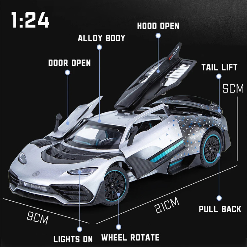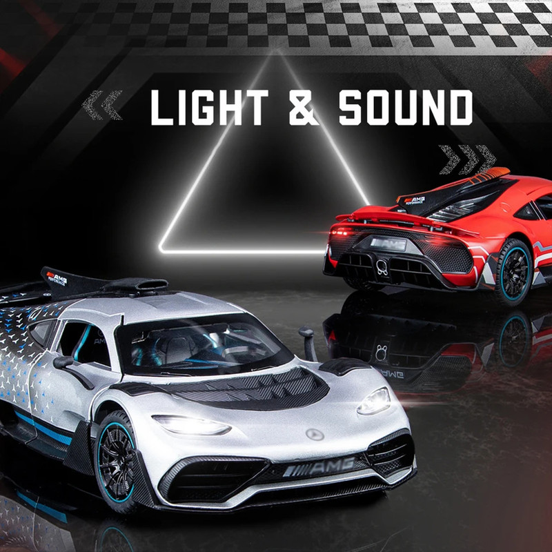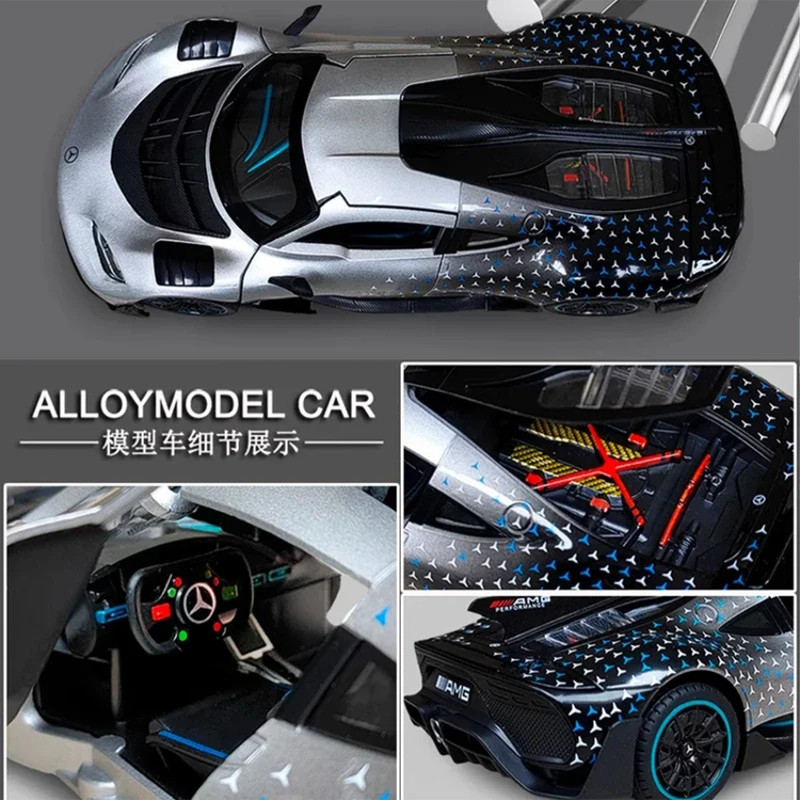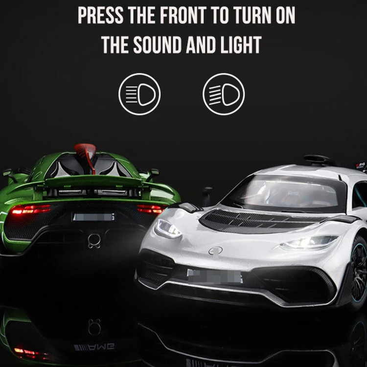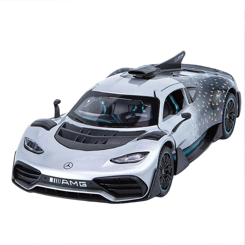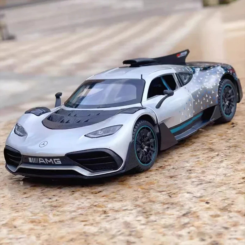 سه درب باز شو - باله عقب باز شو و متحرک-دارایچراغ های عقب و جلو - موزیکال(شامل سه موزیک : استارت و گاز دادن-دزدگیرو باز شدن درب ها )-فرمان پذیر-جزئیات بالا-مرسدس-آامگ وان (انگلیسی: Mercedes-AMG One؛ آر۵۰، شناختهشده با نام وان (انگلیسی: ONE)) یک خودروی اسپورت اتصال برقی دوگانه در دست ساخت با تولید محدود است که توسط مرسدس-آامگ و با بهرهمندی از فناوری مشتقشده از خودروهای فرمول یک تولید خواهد شد- توجه کنید : این ماکت فلزی فاقد جعبه مقوایی میباشد به علت اینکه جعبه این ماکت به صورت هشت عددی عرضه میگردد